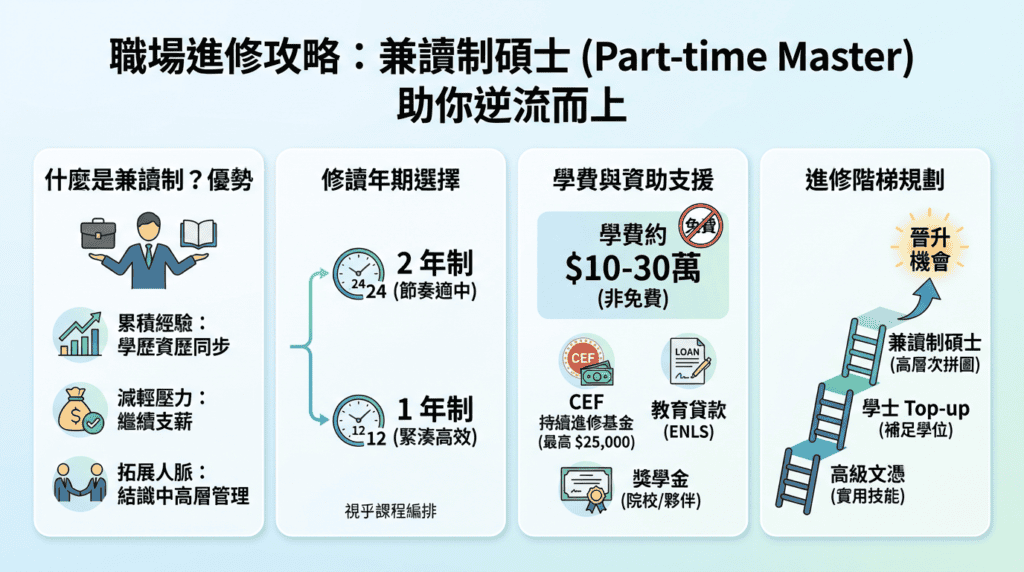 在競爭激烈的香港職場,單靠學士學位有時難以突破晉升瓶頸。許多在職人士都希望透過進修來提升競爭力,而兼讀制碩士(Part-time Master)便成為了平衡工作與學業的首選方案。